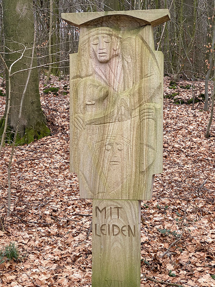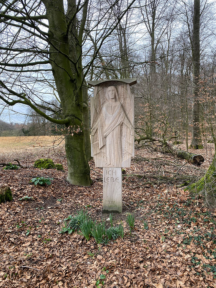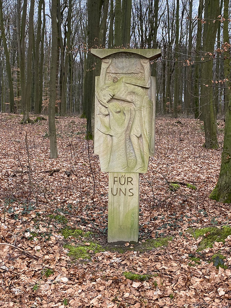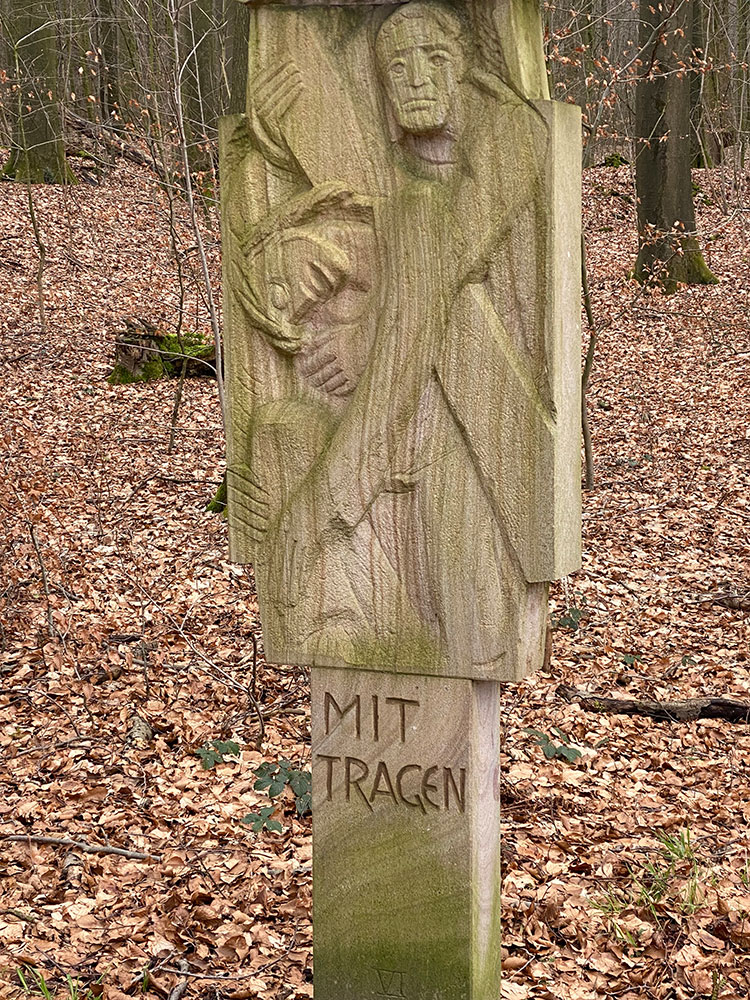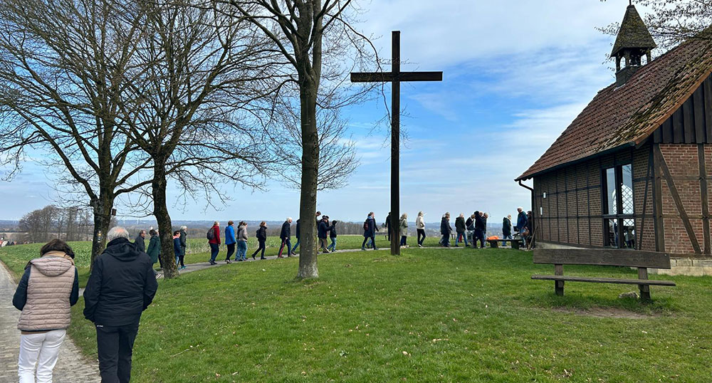 am Karfreitag lade ich jedes Jahr zum Kreuzweg in den Baumbergen ein. Der Weg erstreckt sich ungefähr auf einen Kilometer, ich gebe an jeder Station einen Impuls, der den Kreuzweg Jesu in unsere heutige Zeit übersetzt, so dass sich die Menschen mit ihren Fragen, Sorgen, Nöten und ihrem Leid wiederfinden können.